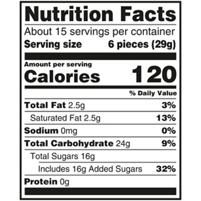 Starburst Original Fruit Chews - Fun Size - Spangler Candy Nutrition Facts: This piece size is 5 grams and serving size is 6 pieces totaling 29 grams. About 391 servings per container. 120 calories per serving size. 2.5 ...