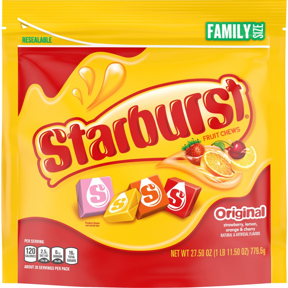 Starburst Share Size Fruit Chews - H-E-B Starburst Share Size Fruit Chews ; Total Carbohydrate, 34g, 11% ; Dietary Fiber, 0g, 0% ; Sugars, 22g ; Protein, 0g ...