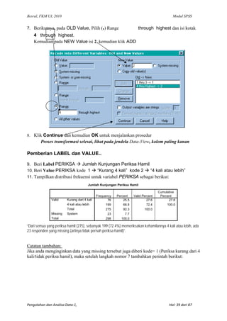 libguides.library.kent.edu › SPSS › AutomaticRecodeSPSS Tutorials: Recoding String Variables (Automatic Recode) Jul 22, 2022 · User-missing values from VAR00001 Old Value New Value Value Label blue 1 blue green 2 green orange 3 orange red 4 red violet 5 violet 999 M 6M 999 As you can see from the syntax, SPSS first alphabetizes all possible unique nonmissing category values across the two variables, then assigns numeric codes to each category. SPSS - Edit Value Labels with Python - SPSS tutorials spssSyntax += "ADD VALUE LABELS %s %s '%s'.\n"% (var,key,val) print (spssSyntax) end program. Create Syntax for Adjusting Value Labels At this point we'll add the correction for each value label that we developed earlier. The resulting syntax is almost what we need. Bonus points if you detect a problem with it before reading on. Using Syntax to Assign 'Variable Labels' and 'Value Labels' in SPSS Here are the steps to assign value labels (in the same syntax window): Type the command "VALUE LABELS" (be careful of spelling). On the next line (new line not required, but recommended), type the name of the variable you want to assign a value labels to (in my example, the variable is "Example1"; see below). On the next line (new line not required, but recommended), type the number code that ...