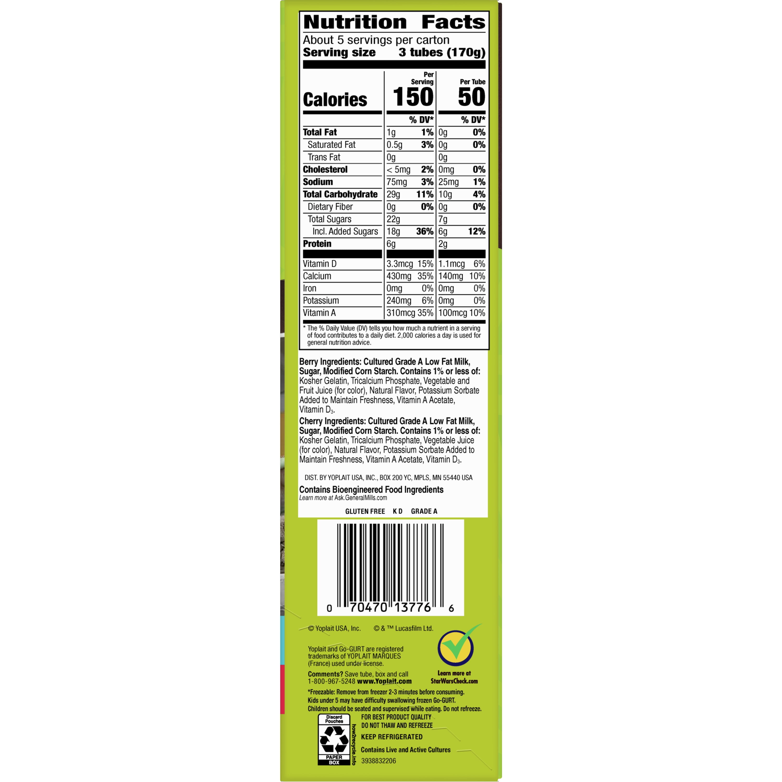 Yoplait Go-GURT Yogurt Berry & Cherry Star Wars the Mandalorian Berry Ingredients: Cultured Grade A Low Fat Milk, Sugar, Modified Corn Starch, Contains 1% Or Less Of: Kosher Gelatin, Tricalcium Phosphate, Vegetable And ...