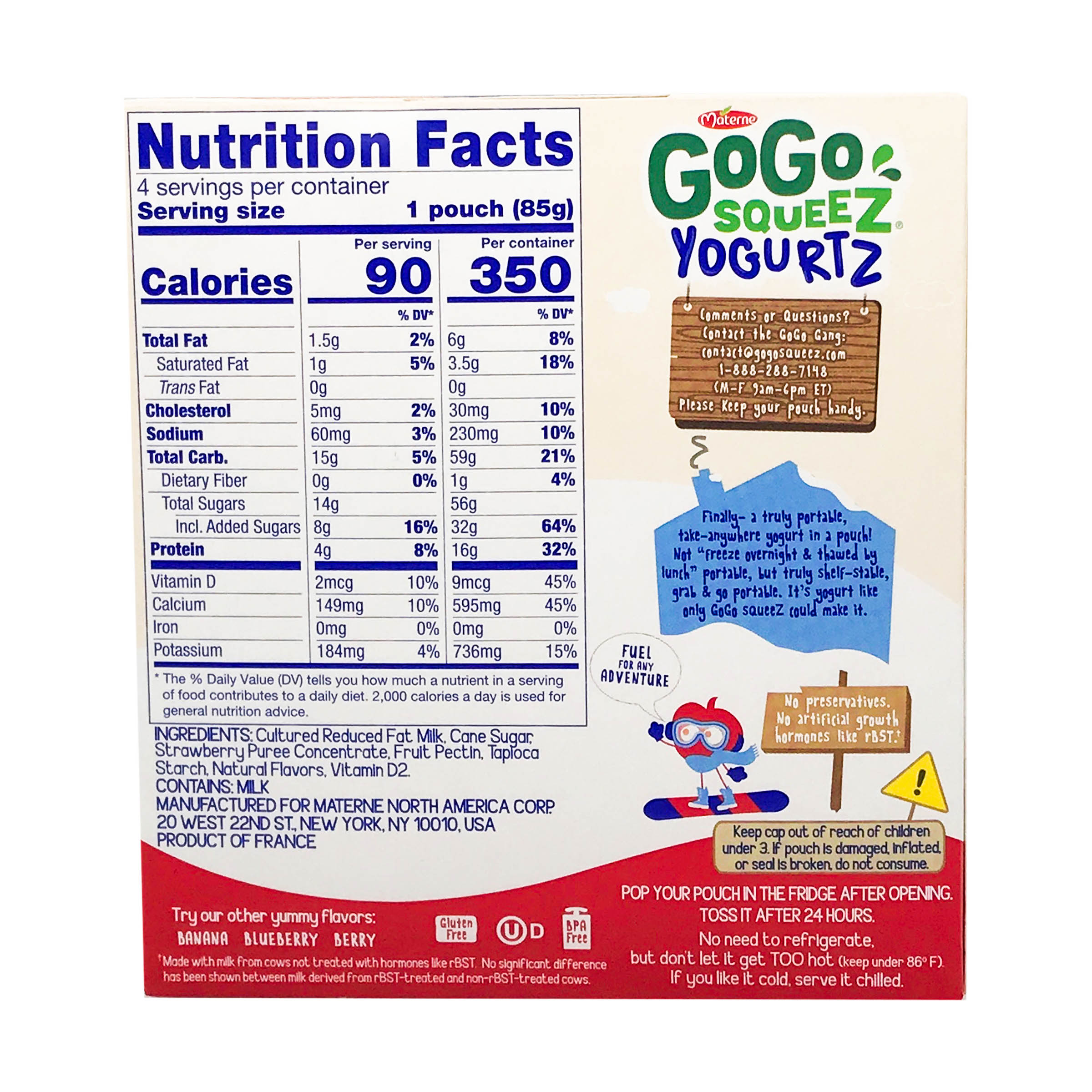 Greek Yogurt Nutrition Facts - FAGE We're proud to use only 100% natural ingredients. We make it delicious and easy to eat nutritious at home and on the go. Like our yogurt that's rich in protein and calcium, and made with our family's very own live active cultures. OUR PRODUCTS With FAGE, You Say YES to No. No GMO's No rBGH (Growth hormones)* No artificial flavors Is Go-Gurt Healthy? Read This To Find Out - Being Human The short answer is, yes, you can eat Go-Gurt daily. While it's not recommended as a primary source of nutrition, Go-Gurt can be part of a balanced diet. Go-Gurt is made from a yogurt base, which means it contains the same probiotic bacteria that other yogurts have. This includes Lactobacillus and Bifidobacterium. Yoplait Go-Gurt, Low Fat Yogurt, Disney Frozen Variety Pack, 2 oz, 16 ct YOPLAIT GO-GURT: Creamy Disney frozen strawberry & vanilla yogurt for the perfect breakfast or afternoon snack. ... Potassium Sorbate Added to Maintain Freshness, Natural Flavor, Vitamin A Acetate, Vitamin D3. Vanilla Ingredients: Cultured Grade A Low Fat Milk, Sugar, Modified Corn Starch. Contains 1% or less of: Kosher Gelatin, Tricalcium ...