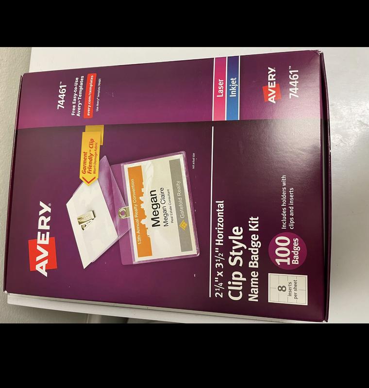 Avery Clip Style Name Badge Kit, Clear with White Inserts, 100/Box ... Avery 74461 top-loading clip style name tags are incredibly easy to clip on and remove. Simply insert a name tag insert into the plastic holder to instantly ...