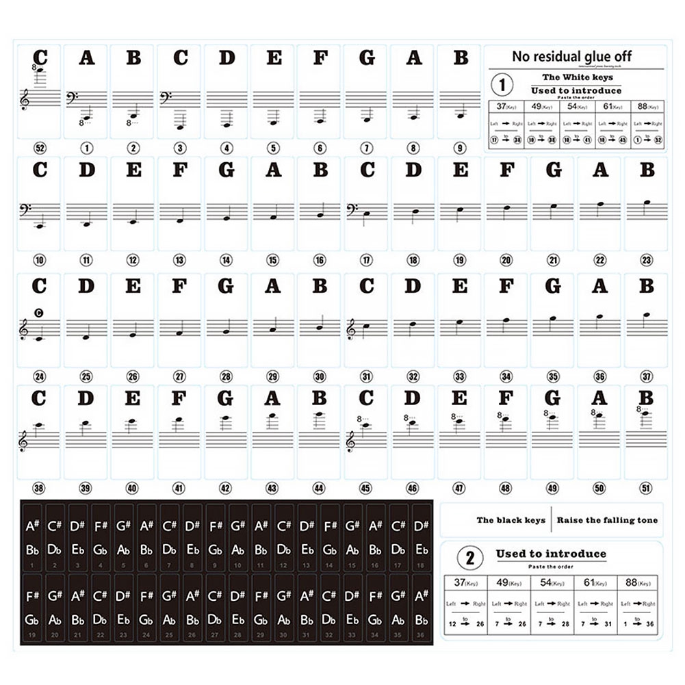 Amazon.com: Piano Keyboard Stickers for 88/61/54/49/37 Key, … Dec 24, 2019 · 1. Wash hands and clean the keyboard before pasting kids piano stickers. 2. Confirm how many keys your piano has, usually 37/49/54/61/88 keys. 3. There is a unique number printed besides each piano key letter. According to the number sequence of the installation manual, from the keyboard left to right, paste the stickers corresponding to the ...