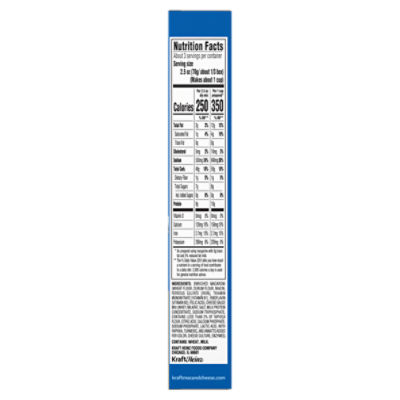 Kraft Dinner - Wikipedia Prepared Kraft Dinner is 71% carbohydrates, 11% protein, and 5% fat (table). In a 100 gram (3.5 oz) reference serving, Kraft Dinner supplies 382 calories and rich contents (20% or more of the Daily Value, DV) of sodium (56% DV) and iron (25% DV), with calcium in moderate content (15% DV) (table). Preparation [ edit] Original Cup 2.05 oz | Kraft Macaroni & Cheese enriched macaroni product (wheat flour, glyceryl monostearate, niacin, ferrous sulfate [iron], thiamin mononitrate [vitamin b1], riboflavin [vitamin b2], folic acid); cheese sauce mix (whey, corn syrup solids, milk, palm oil, milk protein concentrate, modified food starch, milkfat, salt, maltodextrin, contains less than 2% of calcium carbonate, … Kraft Dinner, Original Nutrition Facts - Eat This Much Calories, carbs, fat, protein, fiber, cholesterol, and more for Kraft Dinner, Original ( Kraft). Want to use it in a meal plan? Head to the diet generator ... Calories in Kraft Macaroni & Cheese Original and Nutrition Facts Kraft Macaroni & Cheese Original Nutrition Facts Amount Per Serving Calories 350 % Daily Values* Total Fat 11.00g 14% Saturated Fat 4.000g 20% Trans Fat 0.000g Cholesterol 10mg 3% Sodium 710mg 31% Total Carbohydrate 50.00g 18% Dietary Fiber 2.0g 7% Sugars 10.00g Protein 10.00g Vitamin D - Calcium 140mg 11% Iron 2.70mg 15% Potassium 330mg 7%