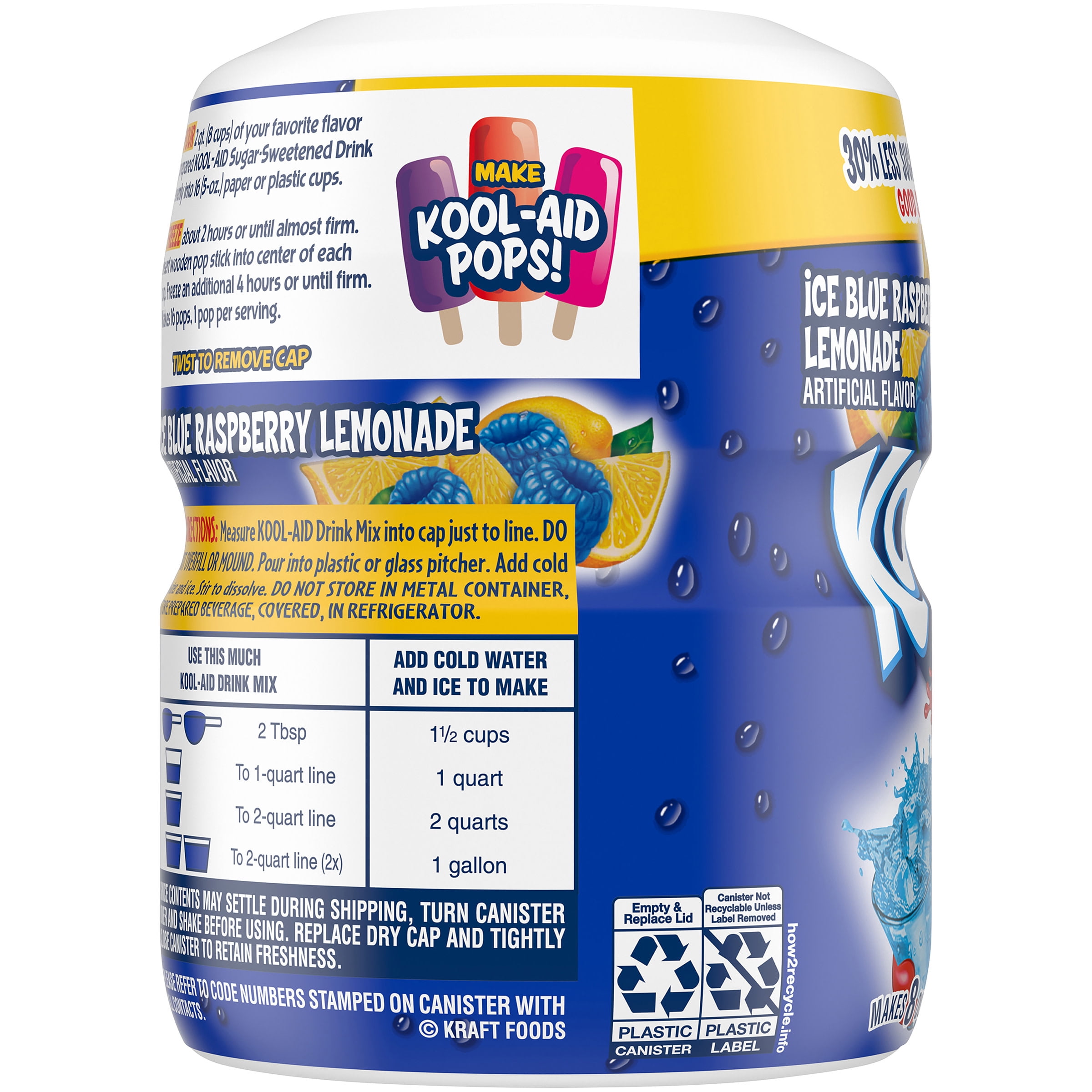 Kool-Aid Powered Drink Mix Packet Blue Raspberry Lemonade ... Do not store in metal container. When prepared with sugar, 12 fl oz contains 150 calories, 39g total carb, 38g total sugars, and 38g added sugar. When prepared ...