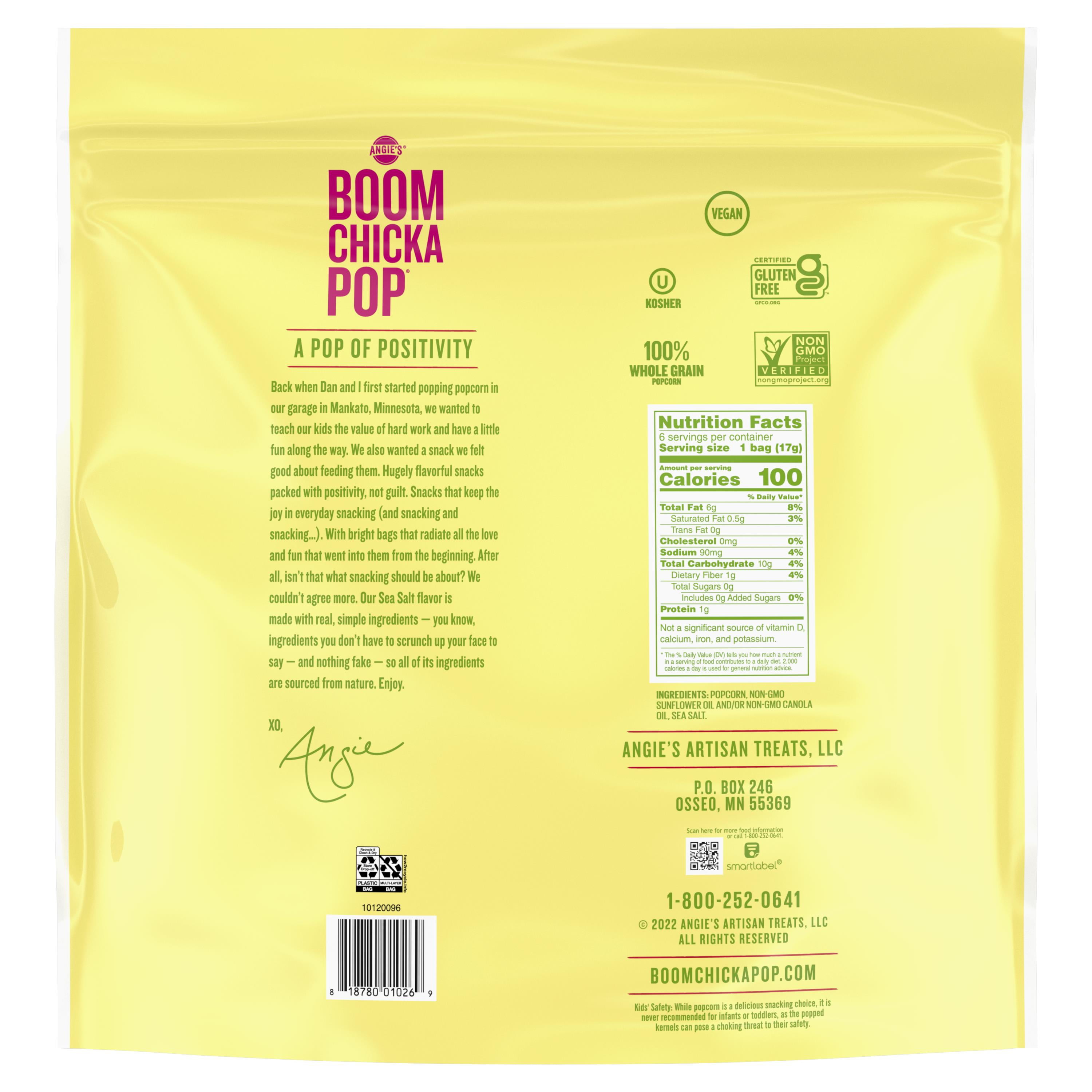Boom Chicka Pop, Sea Salt Popcorn Nutrition - Eat This Much Nutrition Facts. For a Serving Size of 1 package ( 6 g) How many calories are in Boom Chicka Pop, Sea Salt Popcorn? Amount of calories in Boom Chicka Pop, Sea Salt Popcorn: Calories 30. Calories from Fat 13.5 ( 45 %) % Daily Value *. Calories in Boom Chicka Pop Popcorn and Nutrition Facts - FatSecret Web25. Okt. 2020 · There are 100 calories in 1 bag (17 g) of Boom Chicka Pop Popcorn. Calorie breakdown: 55% fat, 41% carbs, 4% protein. Related Popcorn from Boom Chicka Pop: Lightly Sweet Kettle Corn Real Butter Popcorn Sea Salt Popcorn Sweet & Salty … Boom Chicka Pop: A Healthy Snack Made From Popped Popcorn Angie's Boom Chicka Pop, a delicious popcorn, is low in carbohydrates and calories. Furthermore, it is safe to consume as part of a keto diet. If you consume more than 25 g of net carbs per serving, you may want to consider eating more later. Sodium%DV%27s 2% is one of the lowest in the world. ANGIES BOOMCHICKAPOP Sweet And Salty Kettle Corn Like your favorite treat at the county fair, each 1-ounce bag of Angie's BOOMCHICKAPOP Sweet & Salty Kettle Corn Popcorn is packed with flavor. Enjoy this whole-grain, non-GMO popcorn as a vegan, gluten-free snack that's made with real, simple ingredients. This salty and sweet kettle corn has 140 calories per bag and 0 grams trans fat per serving.